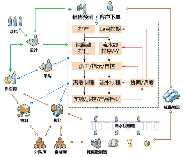 - 从ERP生产计划或销售预测/订单出发,排产/排程,派工,制程管控,实绩/追溯采集,设备采集控制,报工等。