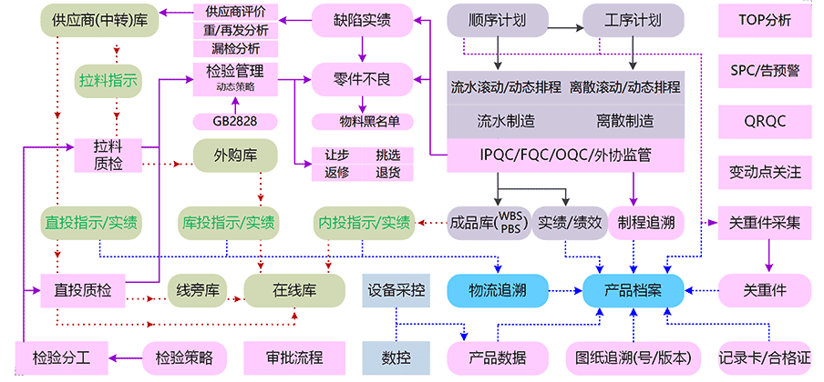 - 制程追溯:各工序人员(加工、质检、调校、测试等)、设备、工装等。